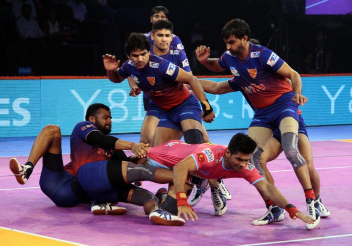 Dabang Delhi K.C. secured their fourth win in Vivo Pro Kabaddi League Season VI as they defeated Jaipur Pink Panthers. Jaipur had a poor match as nobody was there to assist a well performing Deepak Hooda who got raid points. Dabang Delhi K.C. on the other hand were seeing all their raiders in fine form as Naveen Kumar got a Super 10 while Meraj Sheykh and Chandran Ranjit got 9 and 8 raid points respectively. Joginder Narwal also played an important role as he got 5 tackle points which included 2 successful Super Tackles on Deepak Hooda when only 2 men were left on the mat. Mohit Chhillar had a forgettable night as he got only 1 tackle point in his 6 attempted tackles.